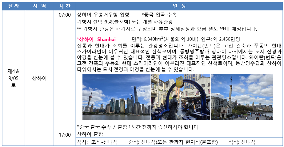 * 여행일정은 기상 및 선사와 현지 사정으로 인해 변경될 수 있습니다.